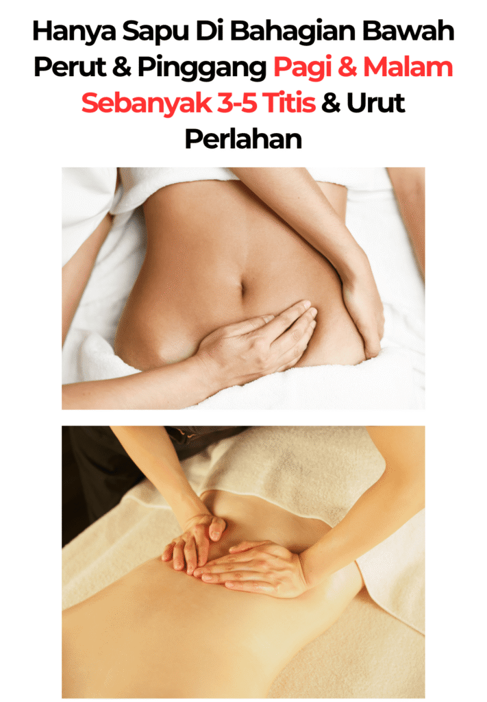 Titiskan 2–3 titik minyak di tapak tangan. Sapu di bawah pusat (sekitar kawasan ari-ari). Urut secara perlahan ke arah bawah, ke bahagian kemaluan & sekitar pangkal alat sulit. Lakukan 1–2 kali sehari – sebaiknya waktu pagi selepas mandi & malam sebelum tidur.